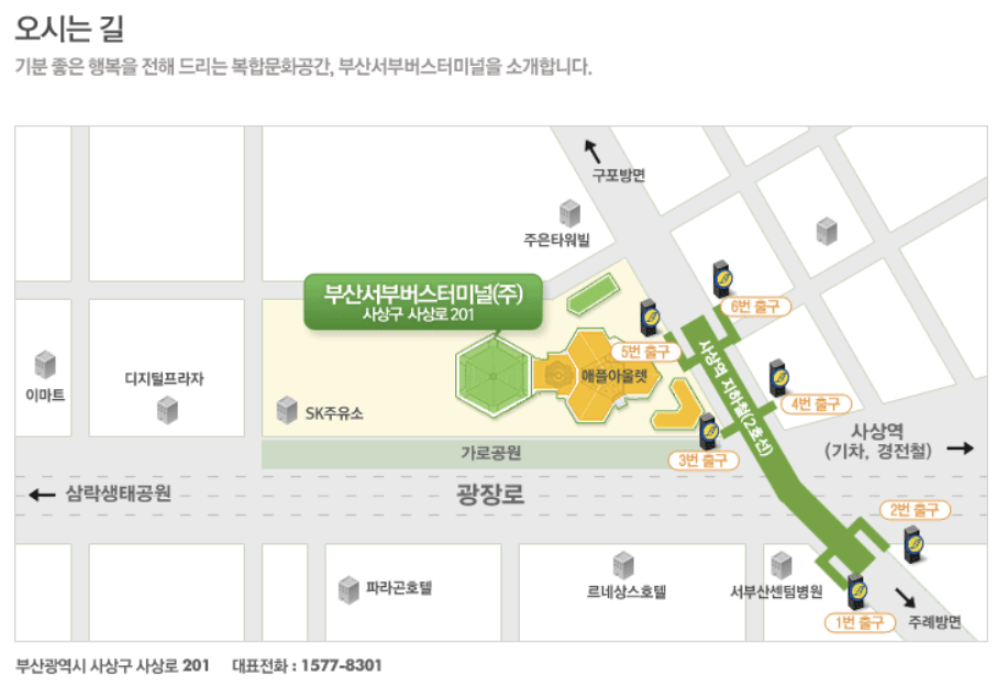 - 지하철: 2호선 사상역 3번 출구에서 바로 연결